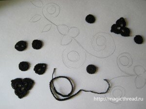 Сделала карандашный набросок будущего мотива и связала для него еще трилистники, просто круги из столбиков с накидом, воздушные цепочки разной длины и 3 отдельных листика по той же схеме.