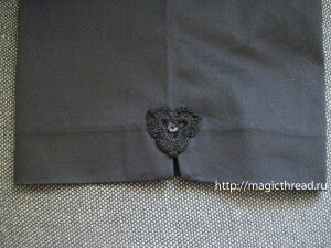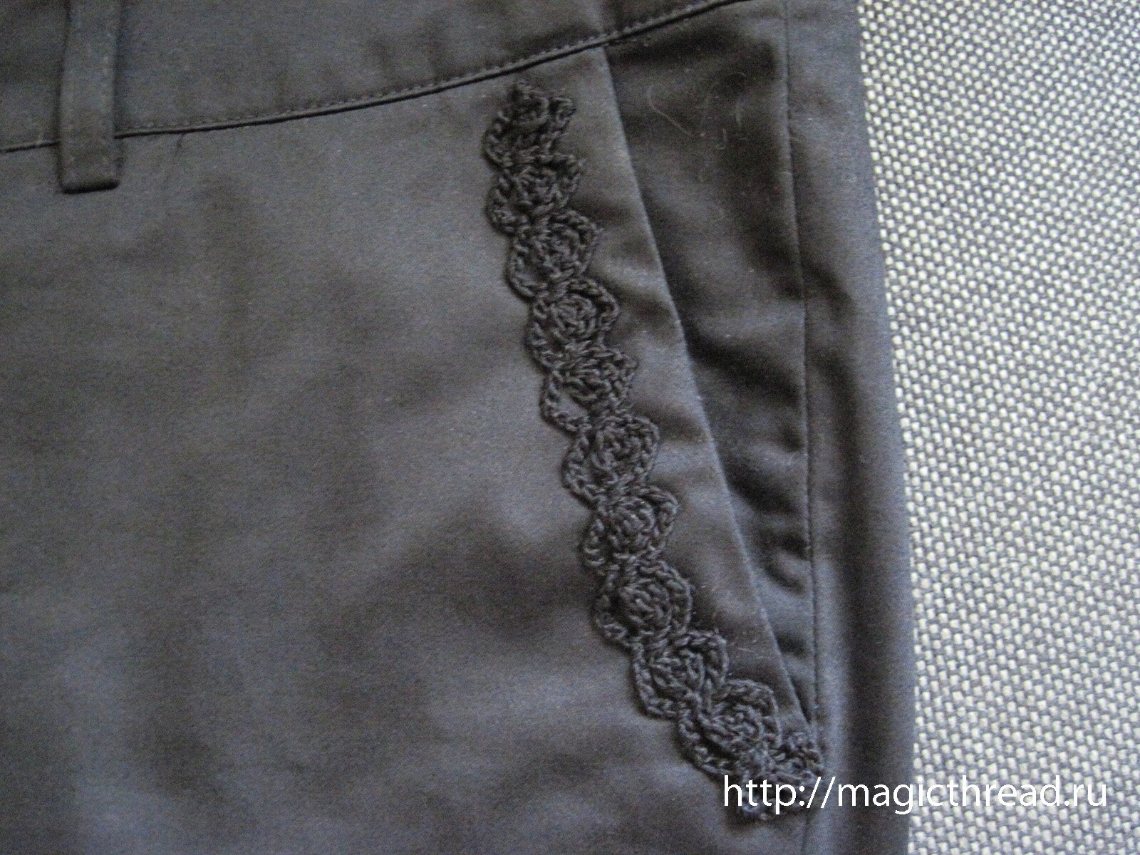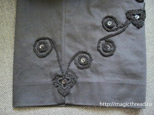 Связала и пришила его к левой брючине. Украсила пайеткой и бисеринкой.