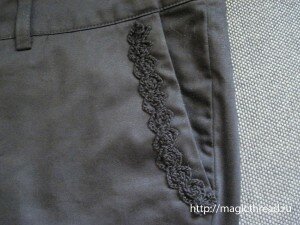 Предлагаю декорировать бриджи трилистником, связанным крючком. Далее подробное описание, фото и схема.