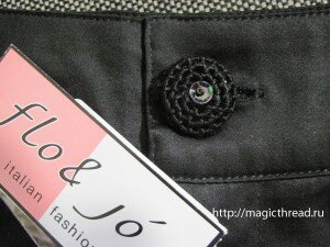 Итак, я купила черные бриджи. Искала специально х/б и без каких либо украшений. Сначала обвязала пуговку. Серединку украсила черными пайеткой и бисеринкой.