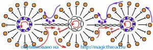 Обратите внимание на стрелочки. Красные показывают схему вязания 1 ряда, а фиолетовые — 2 го.
