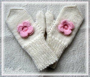 Предлагаю подборку фотографий на тему «Как можно украсить рукавички». Вариантов много: цветочными мотивами, сердечками или помпончиками. Очень нежно смотрятся розовые цветы на белом фоне: