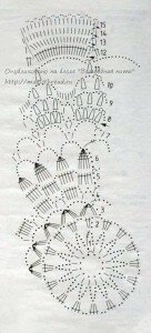 Все обозначения привычные. Единственное уточнение: вытянутые треугольники (8,9,10,11 ряд) - скорее всего это пышные столбики ( т.е. 3 — 4 столбика с накидом провязанные вместе).