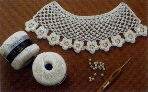 Предлагаю связать воротнички. Основа каждого из них — филейная вязка, а вот украшены они по разному. Первый — декоративными элементами «звездочки» на уголках, а второй — цветочными мотивами по краю всего воротника.