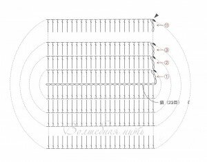 3 ряд и 4 ряд похожи на второй, НО есть прибавки — ближе к краю овала провязываются по 2 столбика с накидом в одну петлю.