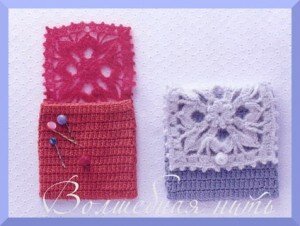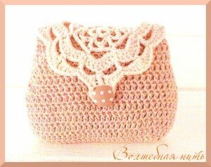 В обоих случаях основное полотно из столбиков с накидами складывается пополам, сшивается или связывается вместе по краям. Ажурная отделка пришивается отдельно. Застегивается кошелечек на пуговку.