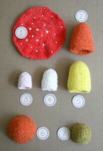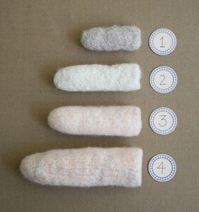 Затем необходимо все детали «свалять». Можно постирать в машине, но автор считает, что это повредит форму. Лучше валять руками, смачивая работу и укатывая ее трубочкой. Подробнее смотрите далее: